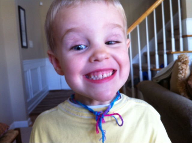 Here was the 4-year-old braiding process. Now if he can just get "right" and "left" down, it will be really simple. He says "right to the middle, left to the middle, etc." but he doesn't know right from left. Soon enough.